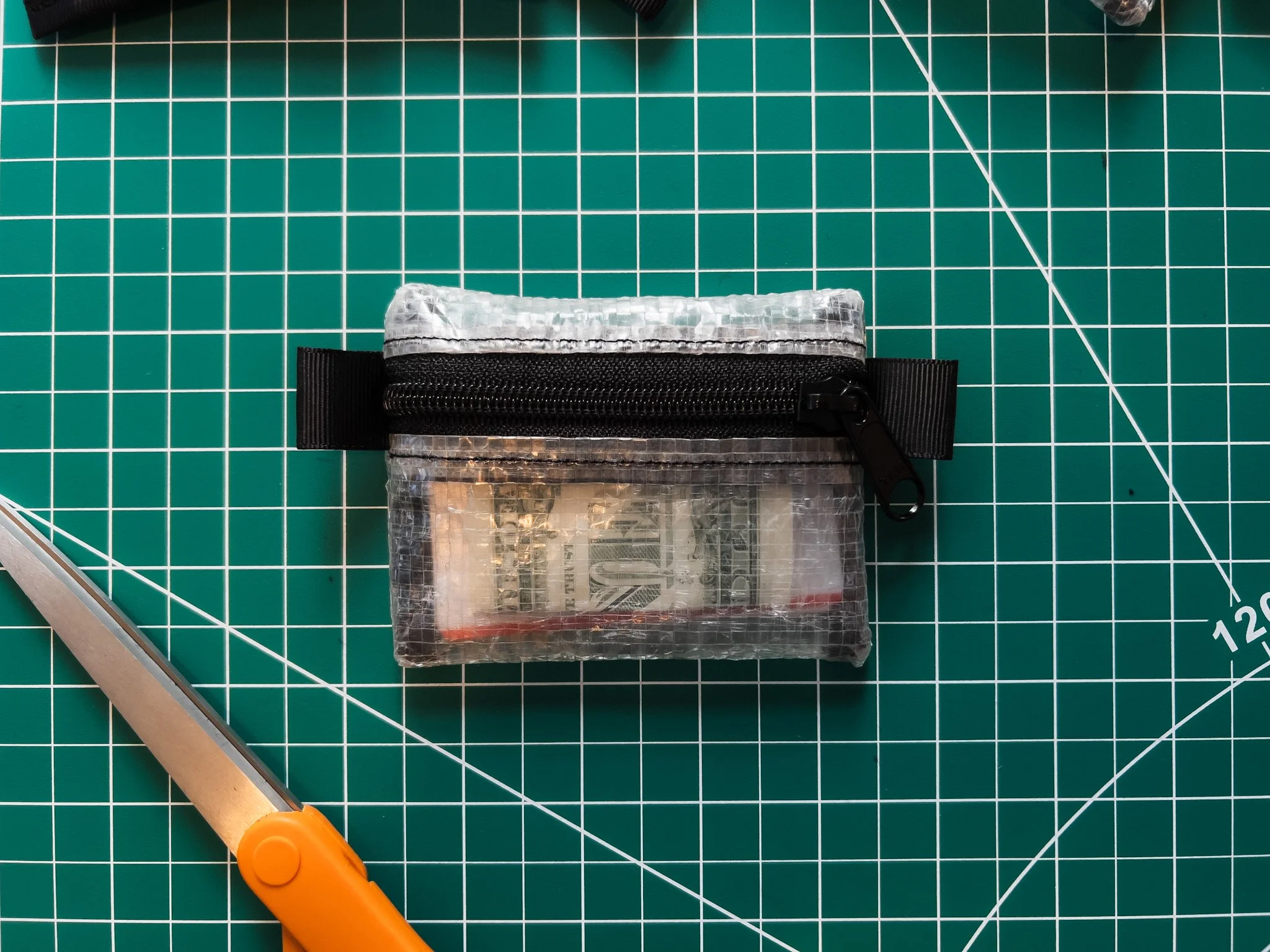 $20 • Handmade from clear 6 mil woven Dura Skrim. Featuring a YKK zipper and two pull tabs, this thing is perfect for some cash, a few cards, a couple keys and your ID. 3.5”L x 2.5” H